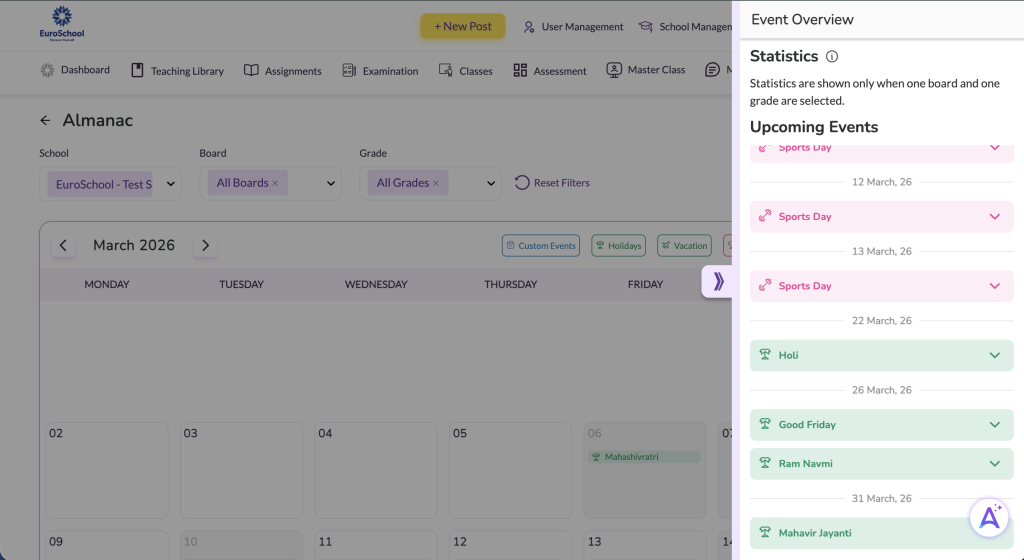 Almanac is the centralized academic calendar module within the K-12 LMS. It provides a structured and reliable source of information for all school-related events, including academic activities, examinations, holidays, vacations, and institutional events.