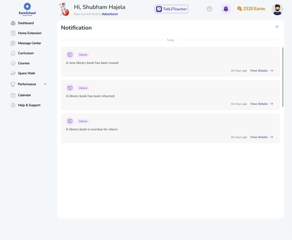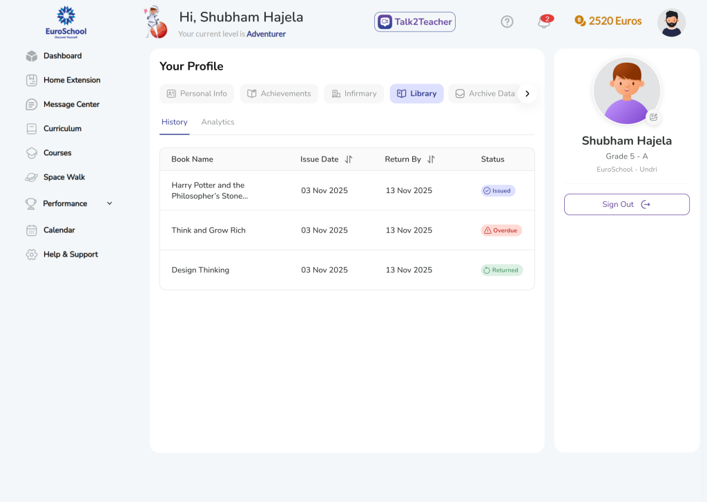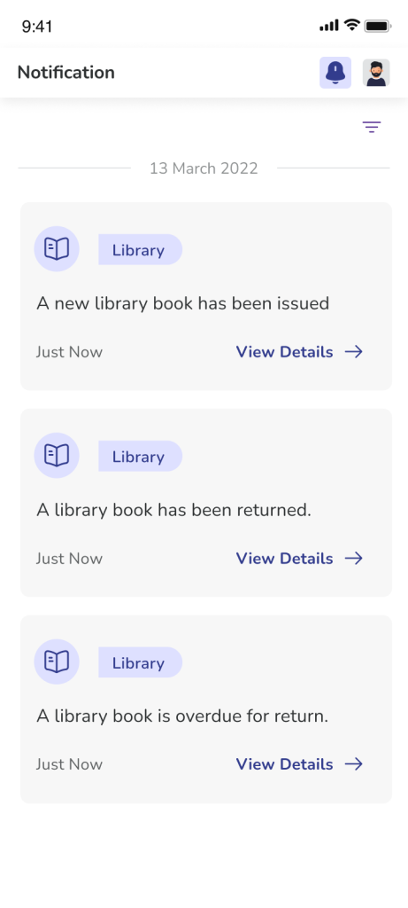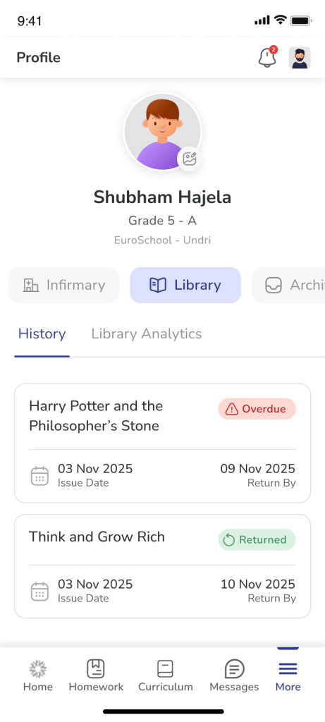 The Library helps you keep track of books issued from the school library. It shows which books are currently borrowed, when they need to be returned, and whether any books are overdue.